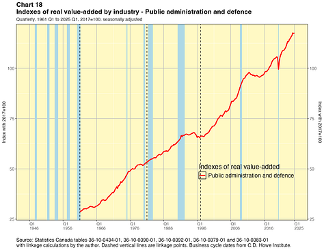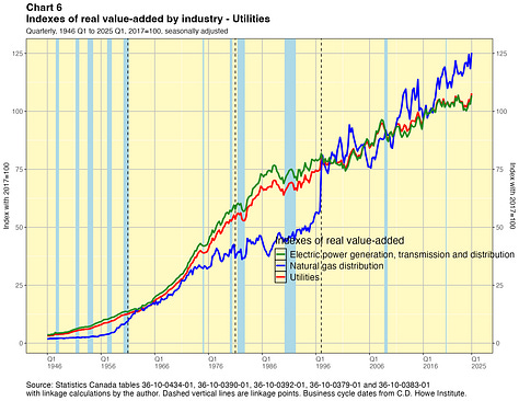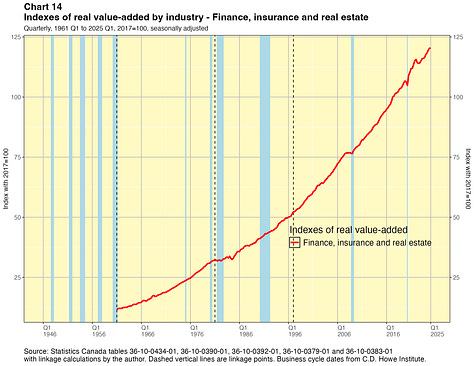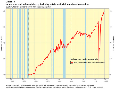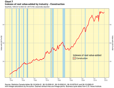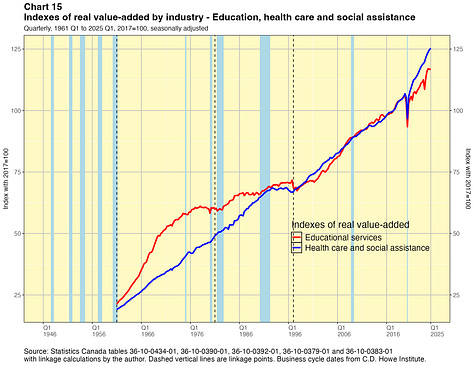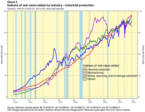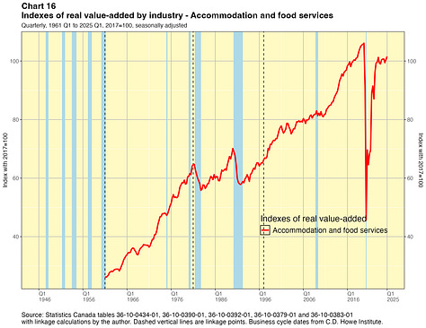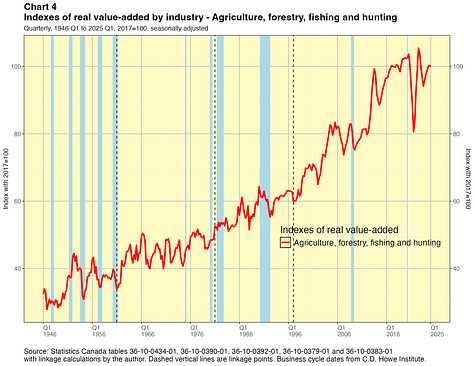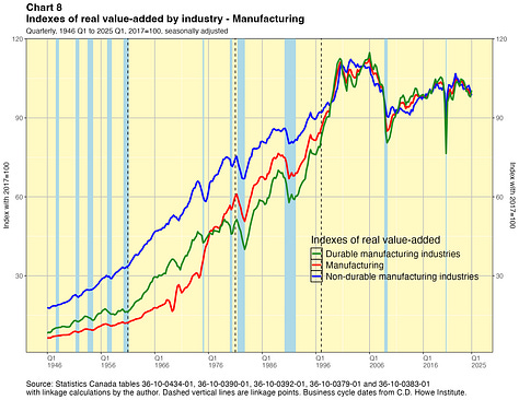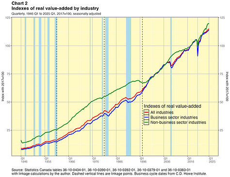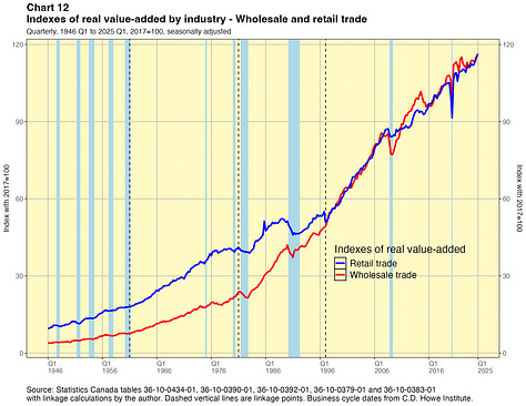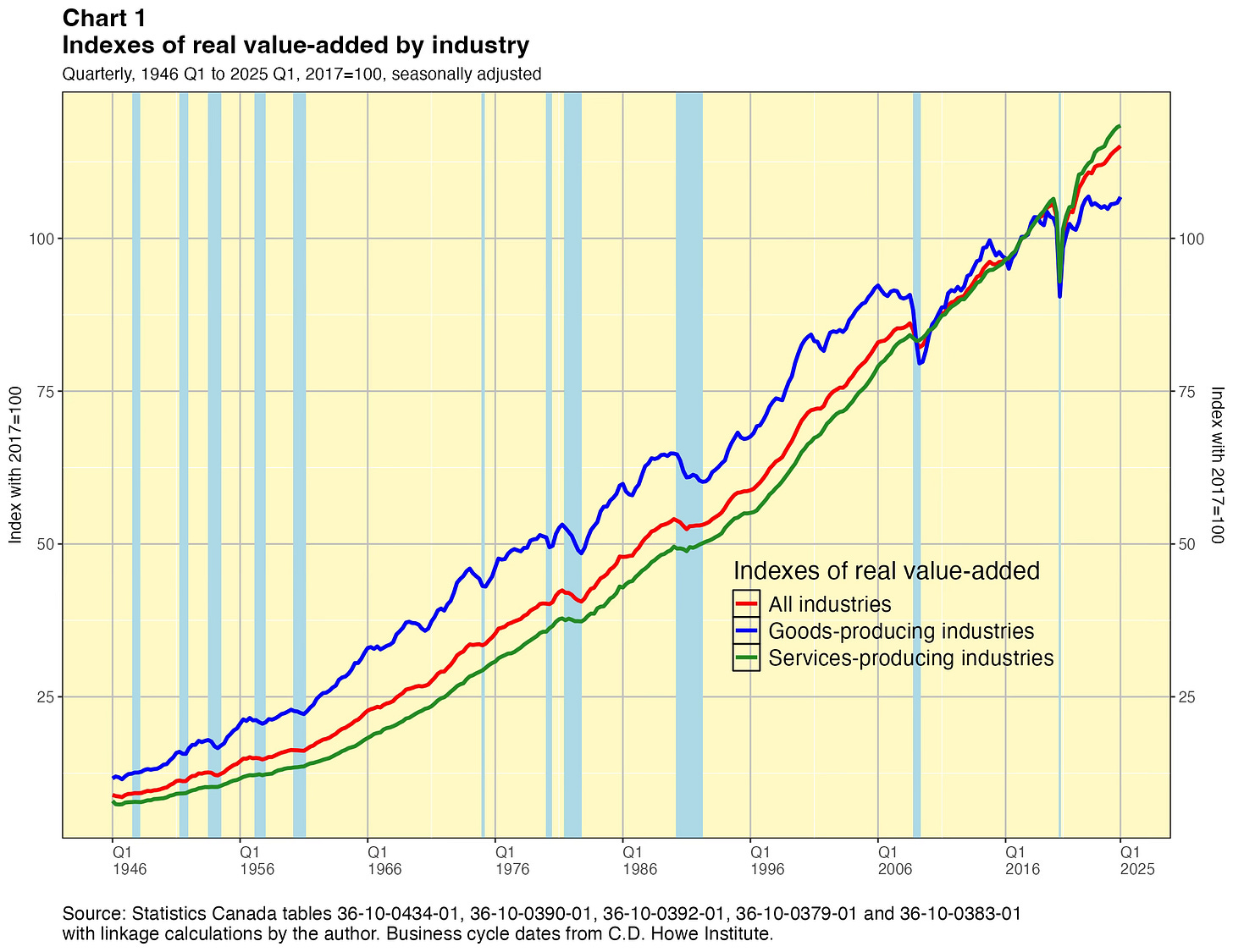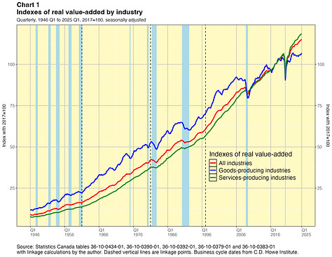 In this paper I take a crack at addressing this problem. I present linked quarterly real GDP-by-industry time series for about 40 industry categories extending all the way back to 1946. These linked data were not costly for me to produce and they have lots of caveats, which I will outline below. They are not the sort of time series that Statistics Canada would normally want to release and they certainly do not have the agency’s seal of approval. They are not official statistics. If Statistics Canada itself did this work, I have no doubt they would do a better job. Nevertheless I think my results are useful for some purposes — as long as the forewarnings noted in this paper are kept in mind. You can find the linked statistics in spreadsheet files here.