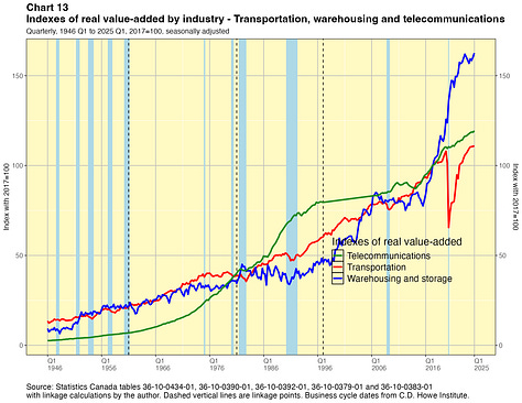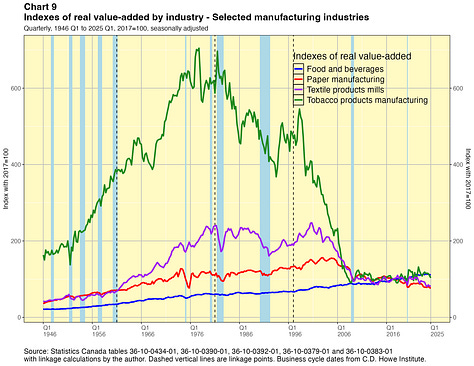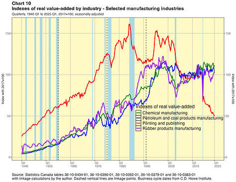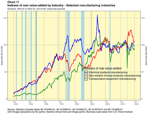 The results are shown graphically in Annex 2. They tell some interesting stories about the evolution of Canada’s industrial structure since the end of the second world war. As noted earlier, the numbers can also be downloaded in spreadsheets.