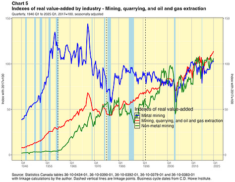 As mentioned, the linked series were derived using data from five different Statistics Canada online tables. Each contained indexes for real value-added by industry. There are three linkages in each case, done across four time periods: 1946-1961, 1961-1981, 1981-1997 and 1997-date.